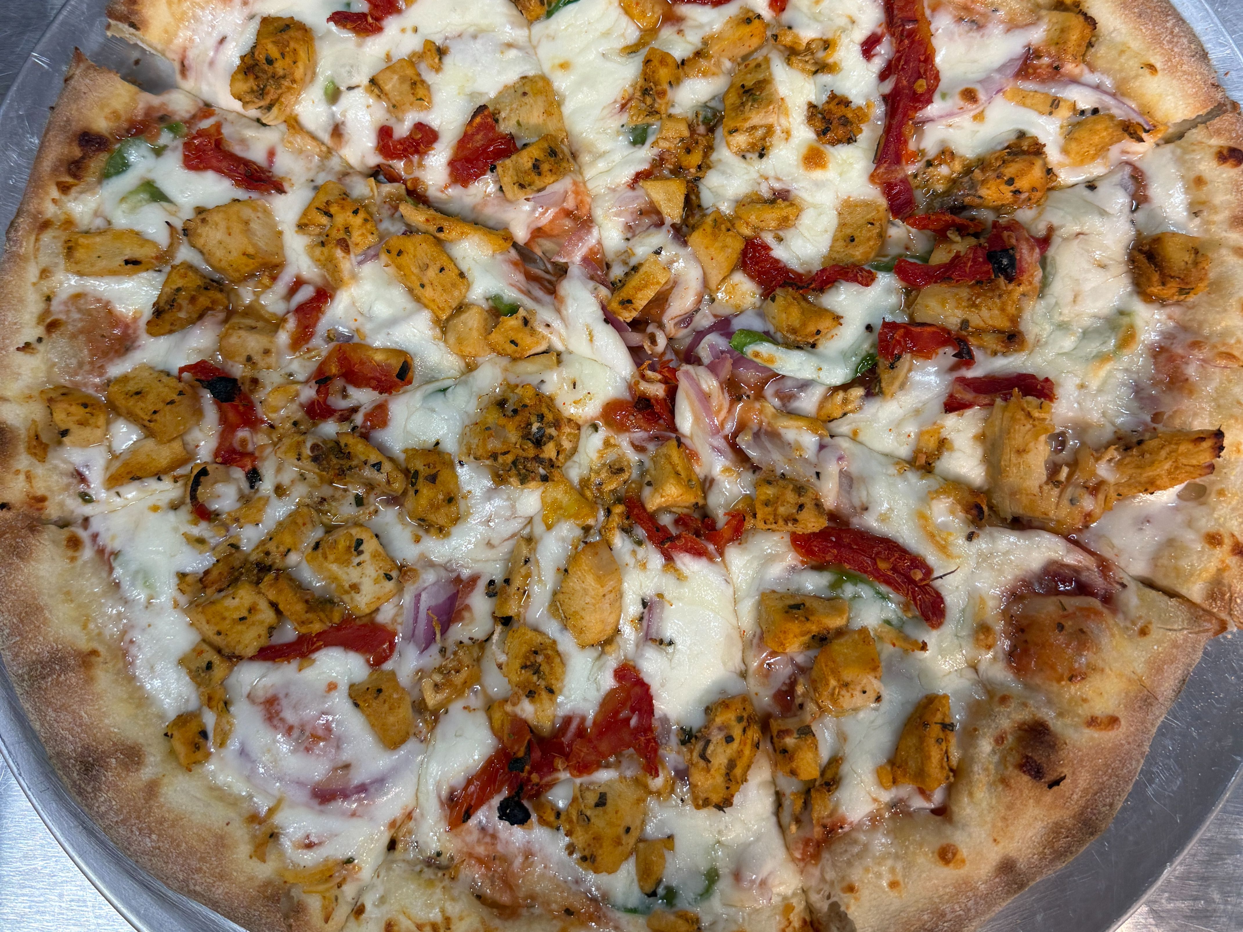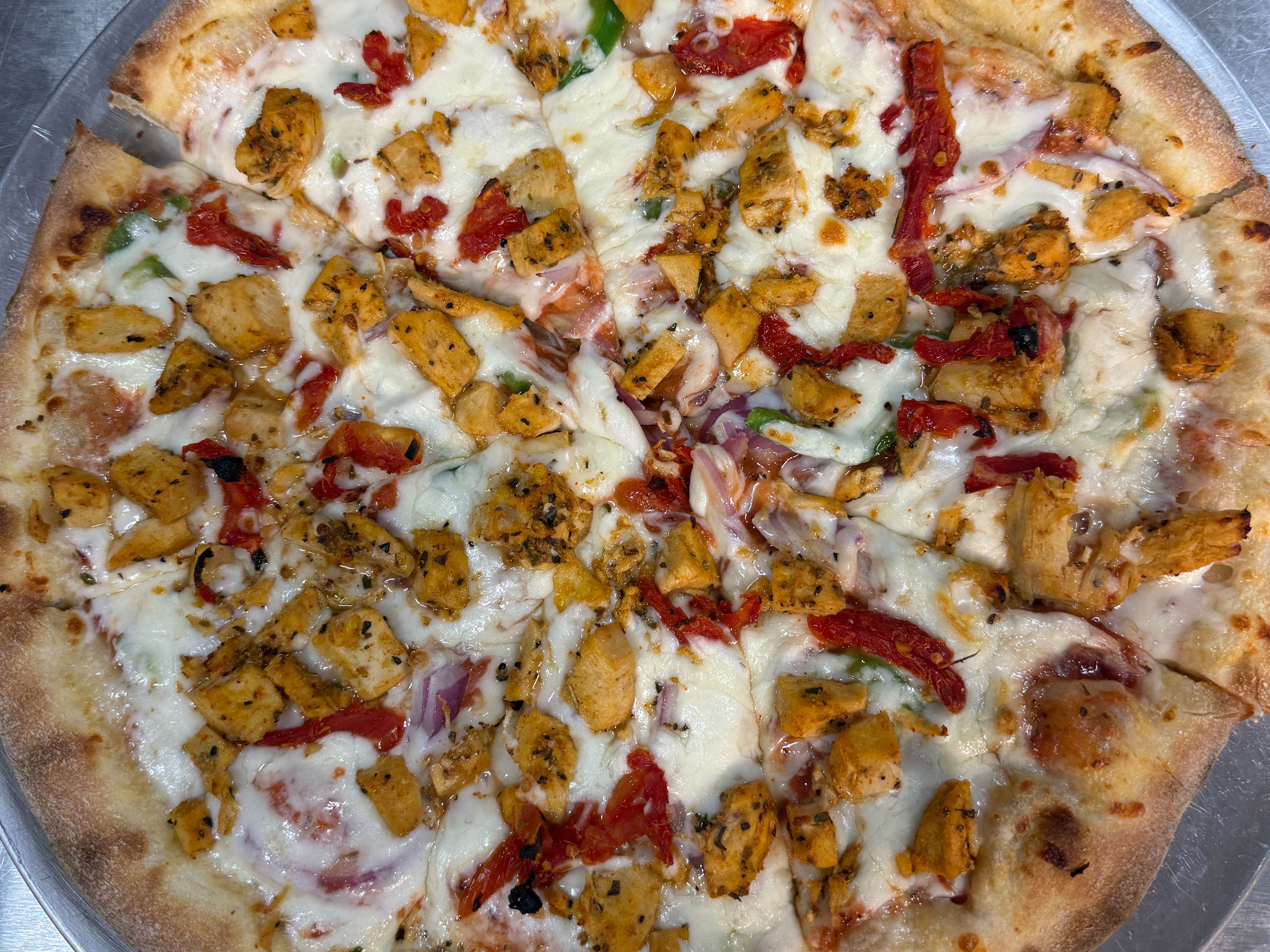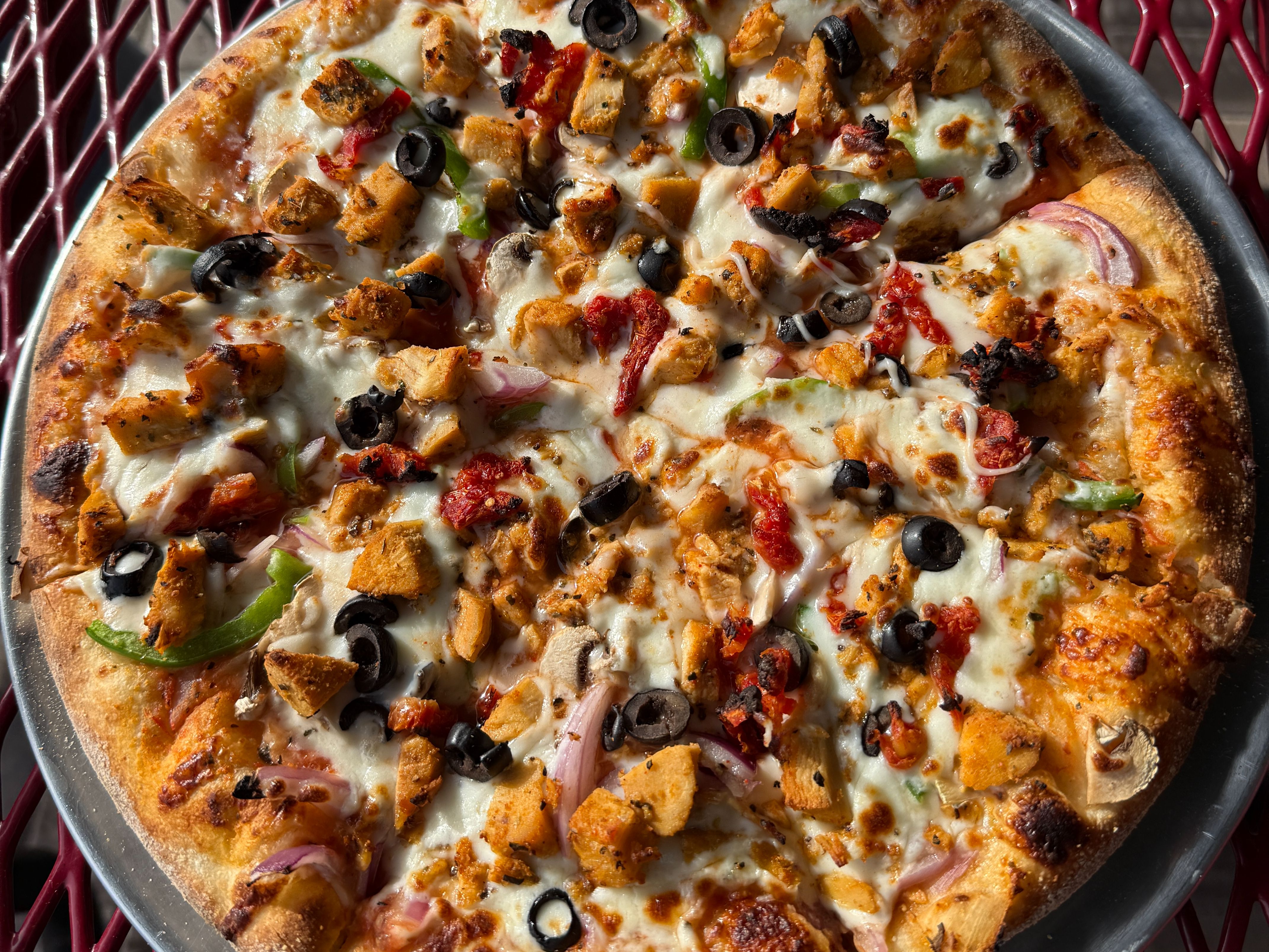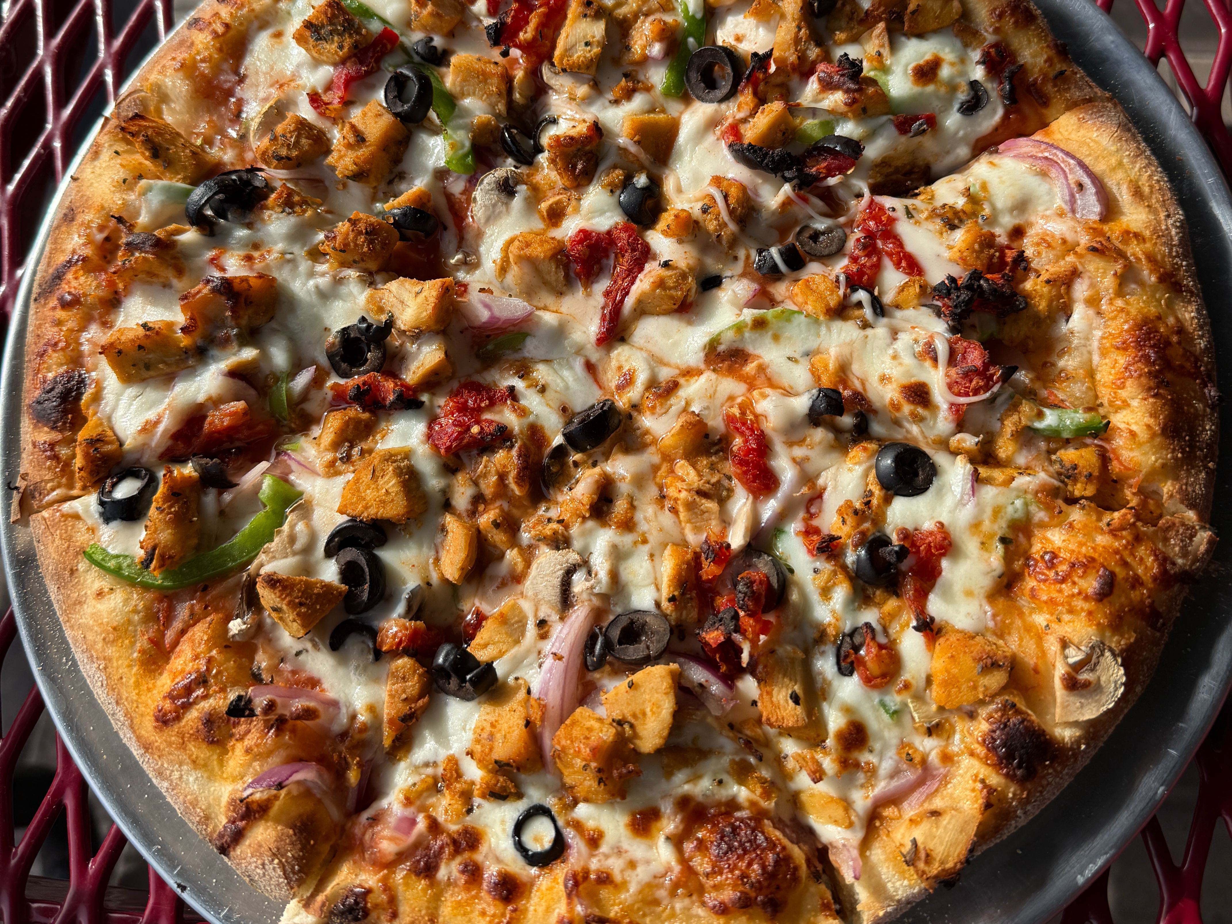 Mushrooms, olives, bell peppers, onions, fresh tomatoes, garlic, pesto & cheese